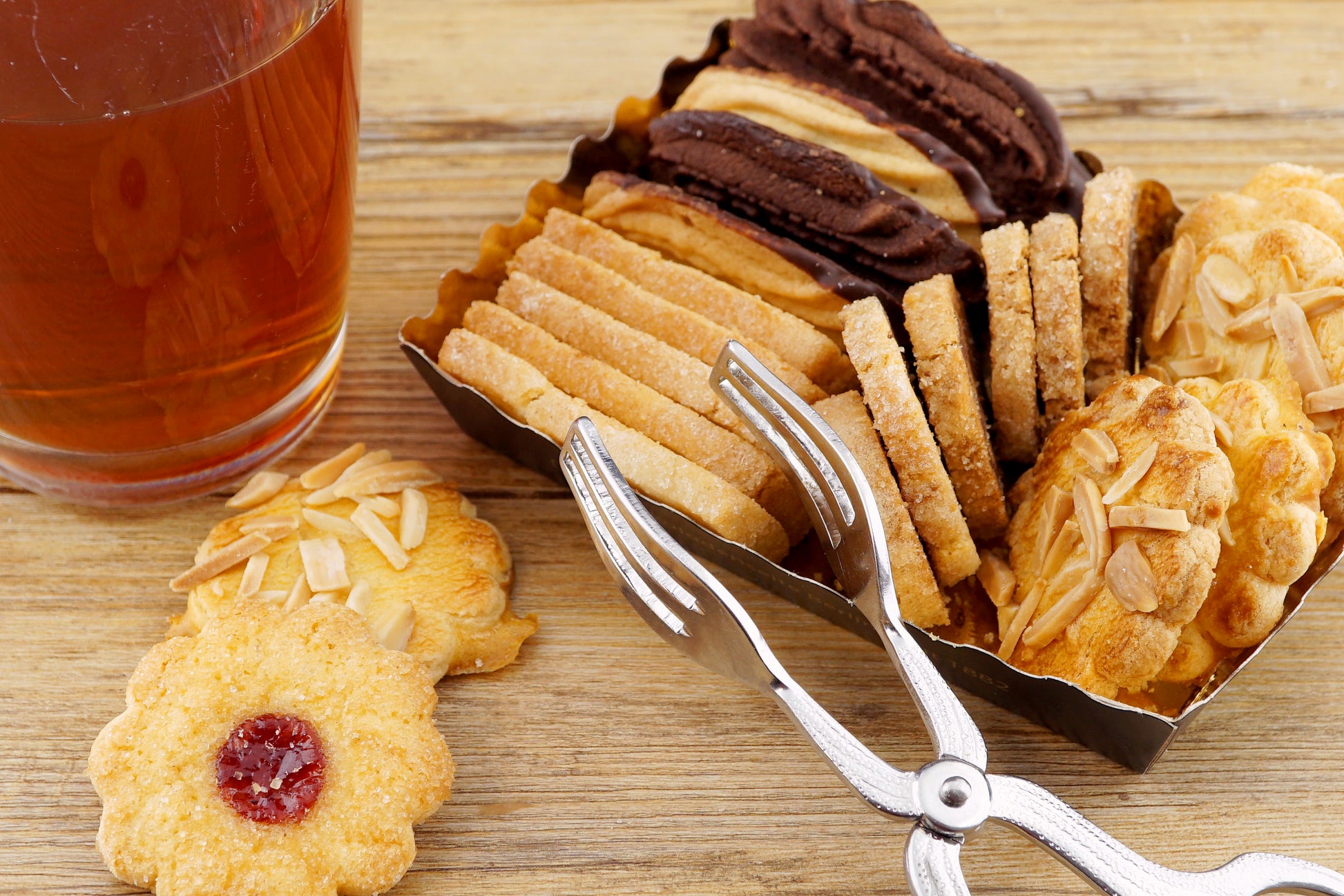 WEIZENMEHL TYPE 550, BUTTER, Zucker, BUTTERREINFETT, WEIZENSTÄRKE, Kakaomasse, SCHLAGSAHNE, Zucker, Kakaopulver, EIER, Kirschen, Kakaobutter, HÜHNEREIGELB, Salz, SOJALECITHIN, Vanilleextrakt, Verdickungsmittel: Carrageen, Zitronenextrakt, Vanillepulver, Invertzuckersirup, Trinkwasser, MANDELN, natürliche Aromastoffe, Aromaextrakte