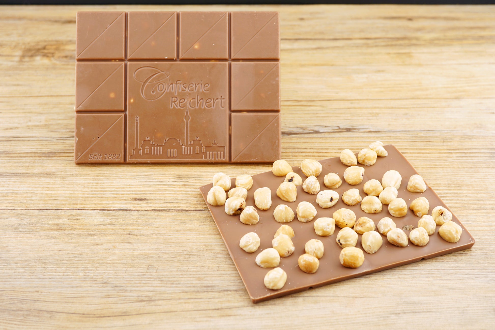 HASELNÜSSE BRAUN, GANZ, Zucker, Kakaobutter, VOLLMILCHPULVER, Kakaomasse, natürliches Aroma, Emulgator: Lecithin